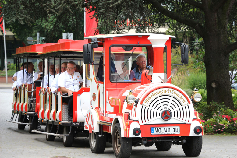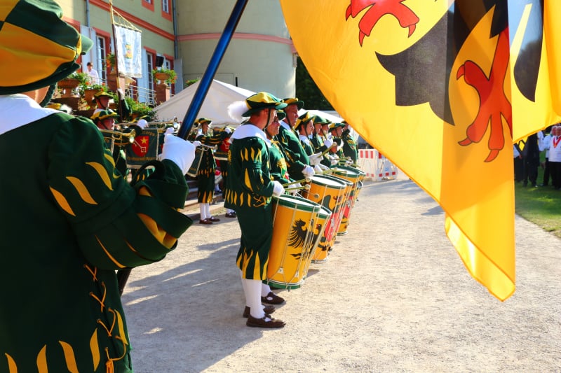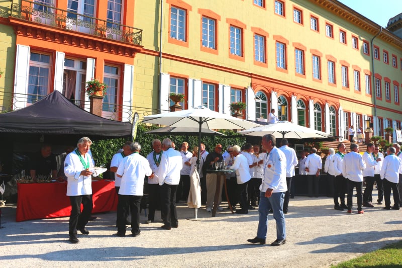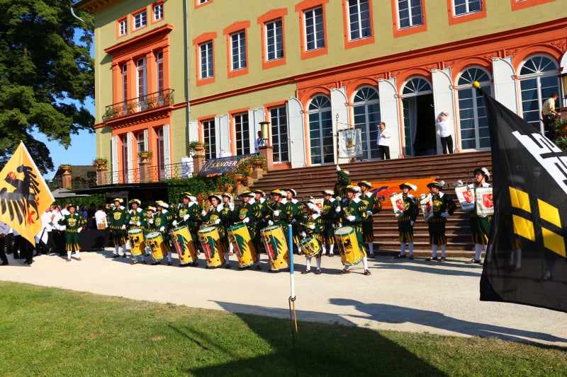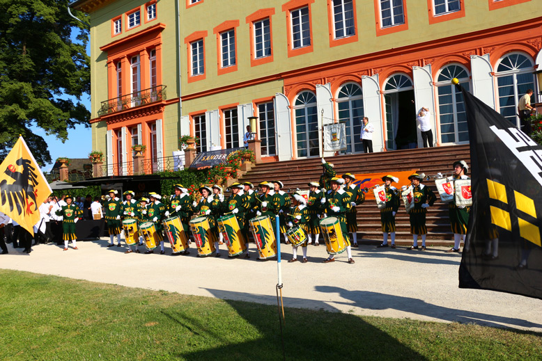 Was für ein Empfang: Kochbrüder, Gäste, Sponsoren und auch Schwägerinnen treten ein in ein wahrhaft kaiserliches Geschehen: Mittelalterliche Rundzelte, bewaffnete Ritter, die Kulisse im Park und auf der Freitreppe zu Schloss Herrnsheim einfach großartig – Mittelaltermarkt – ein einmaliges Erlebnis. Das Fanfarencorps der Nibelungenstadt Worms, perfekt, unterhält uns mit einem Standkonzert. Ein Bier- und ein Weinstand löschen den Durst.