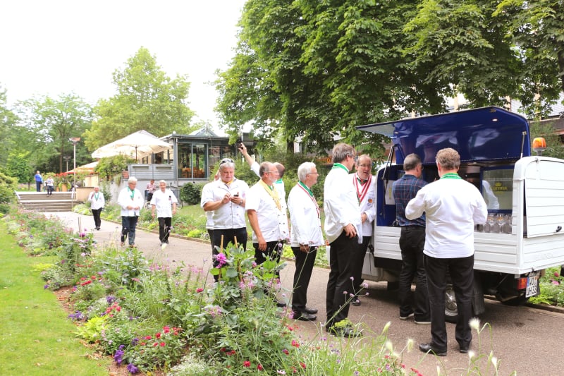 Hier besonders hervorzuheben muss man GMdC Wilfried Neudecker „Soßen Willi“, der ebenso wie LK GMdC Dr. Herbert Geipert, ganze Gänge vorbereitete. Wer glaubt, dass das schon alles ist, wird eines Besseren belehrt: Bernd ruft zum Eintreten in die Festräume, wieder sitzen Kapitel und Großkapitel in bunter Reihe mit Sponsoren und Kochbrüdern. Und hier werden für über 100 Personen 5 Gänge auf hohem Niveau, dazu Spitzenweine – darunter „Große Gewächse“ – organisiert von Chuchileiter Bruder Hans und gestiftet von regionalen Winzern perfekt serviert. Zusammen mit dem Schirmherren, Oberbürgermeister Michael Kissel, erlebten Brüder und Gäste neben dem fulminanten Menü ein buntes Programm.